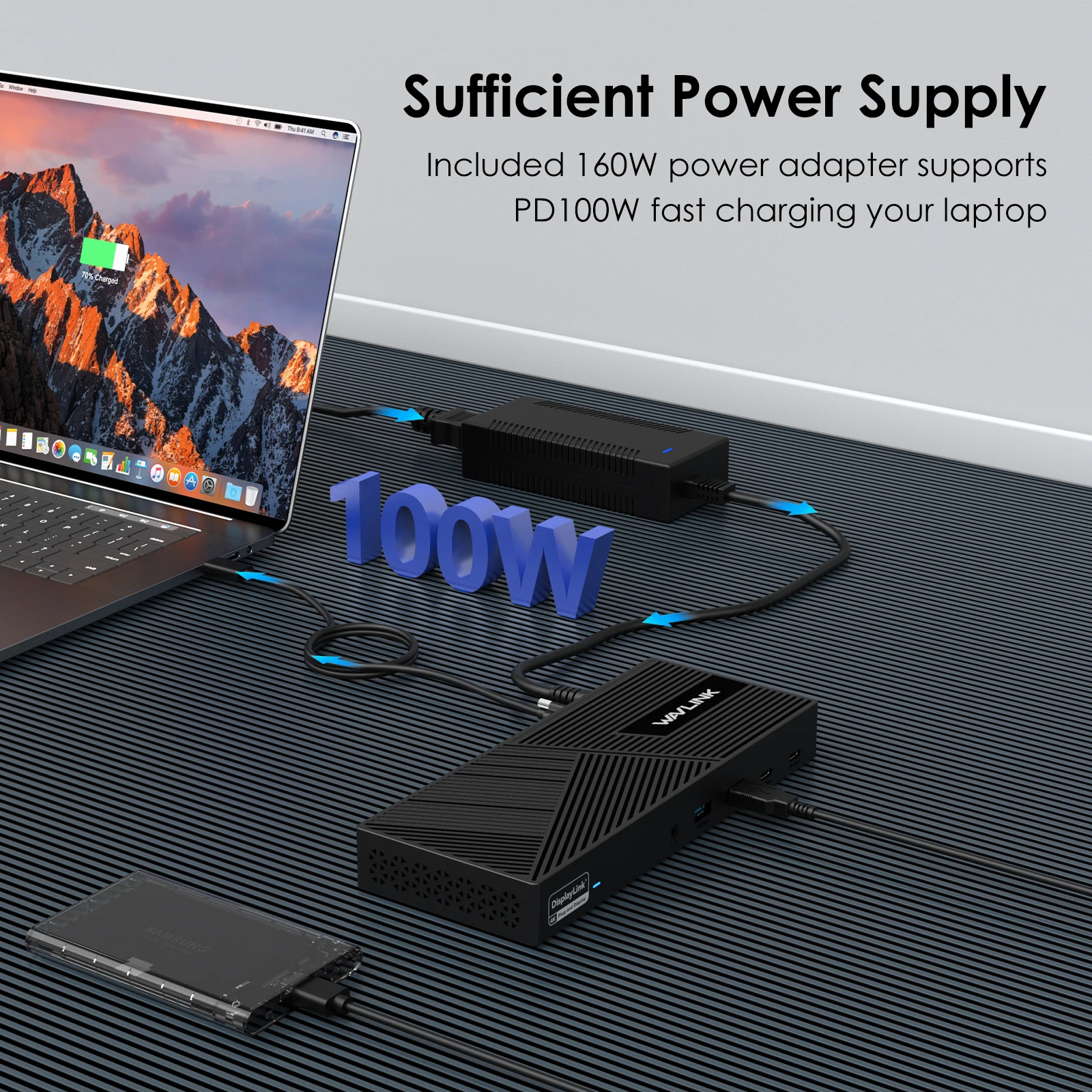 Powerful Charging Capability: Comes with a powerful 160W power adapter, the USB-C (host) charges your laptop with max.100W to keep it running all day, as well as powering your connected peripherals while displaying or transferring data. Worry-free about any low battery situation. Please make sure that the type-c port of your host supports power delivery.