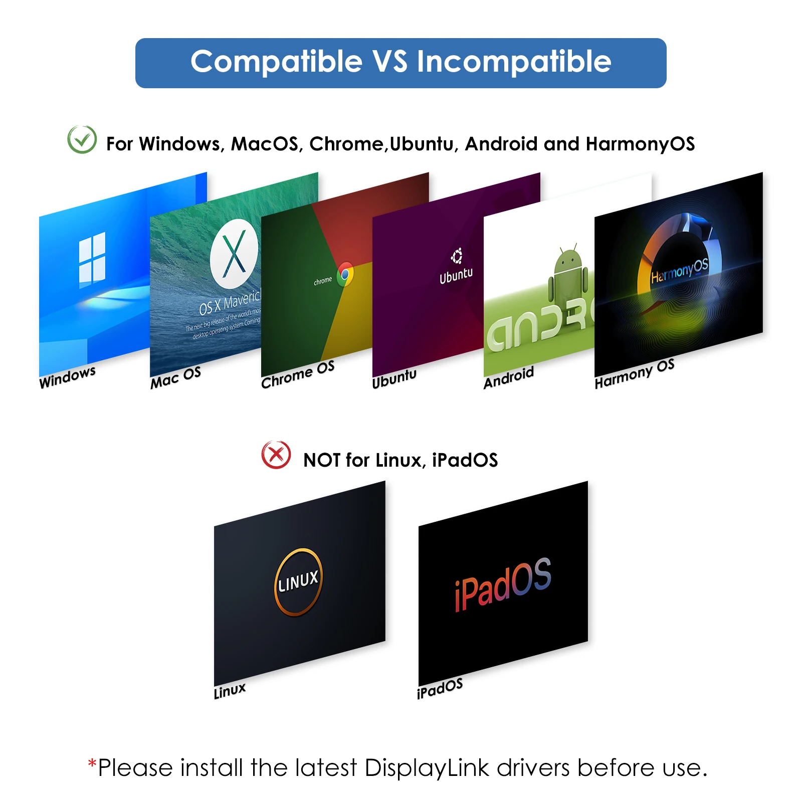Wide Compatibility: Perfect for laptops with USB 3.1 full-function type c port or thunderbolt 3/4 port. Support Windows 11/10/8.1/8/7; Mac OS 10.14-13.x and latest, Chrome OS, Ubuntu 20.04, 22.04, Android and Harmony OS. Unsupported with Unix systems, Linux and iPad OS. (Follow the instructions to download the latest DisplayLink drivers before use.)