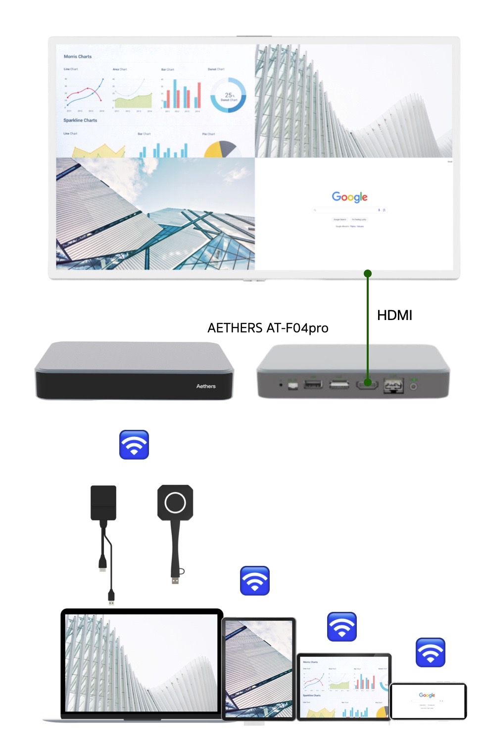 AETHERS AT-F04pro มอบประสบการณ์การทำงานร่วมกันแบบอินเทอร์แอคทีฟสำหรับห้องประชุมหรือห้องเรียน โดยรองรับการแชร์เนื้อหาพร้อมกันได้สูงสุดถึง 4 คน ผู้ใช้เพียงกดปุ่ม Share Screen ก็สามารถแสดงเนื้อหาคุณภาพความละเอียดสูง4K จากแล็ปท็อปขึ้นบนหน้าจอขนาดใหญ่ในห้องประชุมได้ทันที ด้วยตัวส่ง Transmitter ที่มีให้เลือกทั้งแบบ USB Type C หรือ HDMI นอกจากนี้ ยังสามารถใช้แอป EShare แชร์เนื้อหาจากแล็ปท็อป โทรศัพท์มือถือ หรือแท็บเล็ตได้อย่างสะดวกอีกด้วย